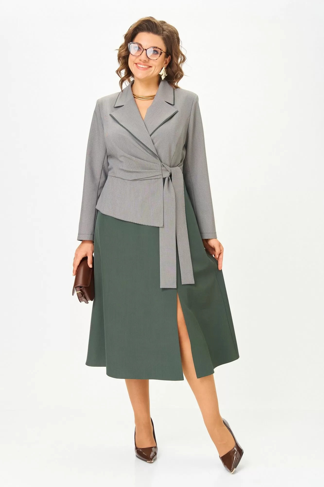 Платье построено на контрасте текстур и цветов: холодная серая «гусиная лапка» + глубокий тёмно-зелёный оттенок хвои. Асимметрия с запахом верхней части платья и разрез на юбке вытягивают силуэт, делают образ динамичным и современным. Зелёная окантовка лацканов и пояс выступают связующим элементом между верхом и низом, создавая цельный и очень дорогой вид. Образ выглядит дорого, интеллигентно и слегка провокационно.
