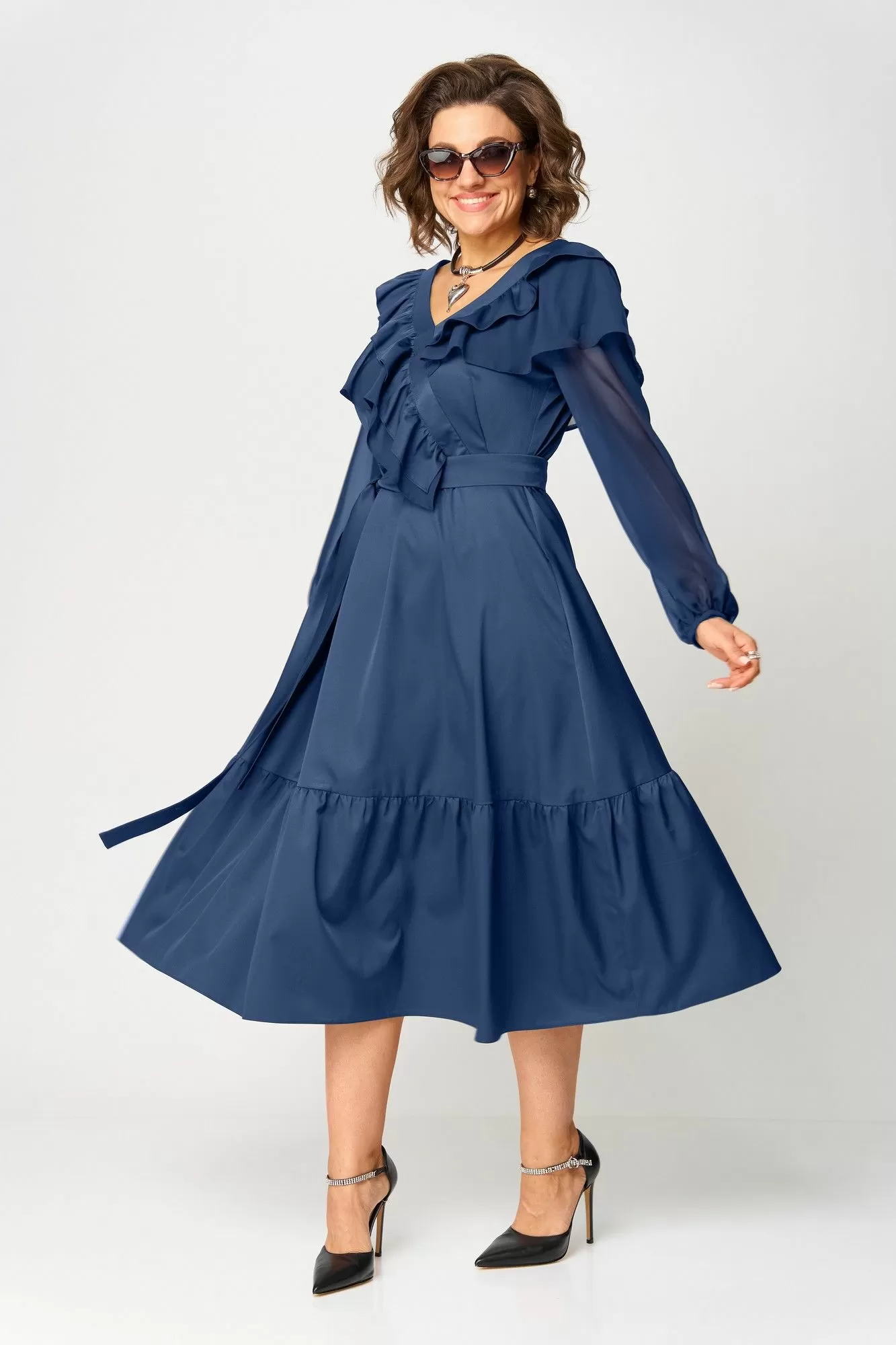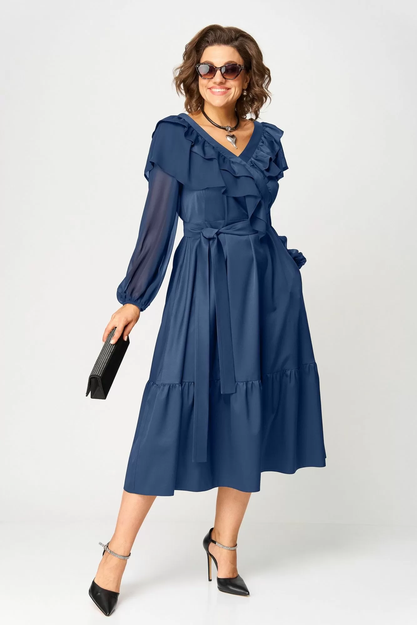 Платье женское нарядно-повседневное полуприлегающего силуэта до талии и расширенное к низу. Платье отрезное по линии талии, вырез горловины V-образный с ассиметричными рюшами из тканей двух дизайнов. Рукав втачной из шифона по низу на резинке. В боковых швах платья обработаны карманы, по низу притавчной волан из основной ткани. Декором платья служит съемный пояс из основной ткани.
