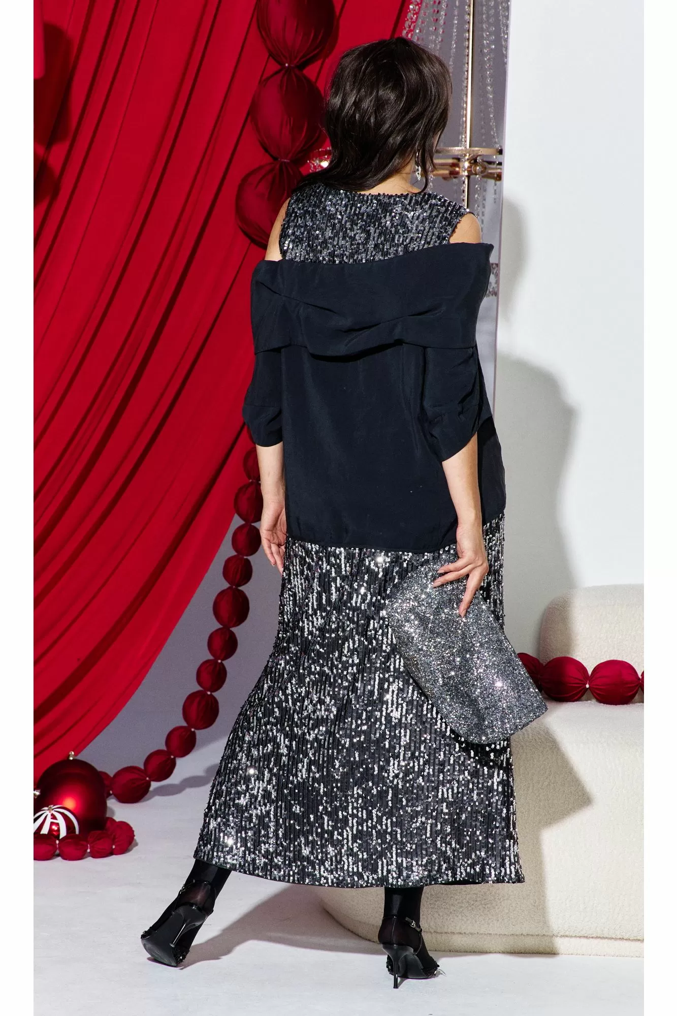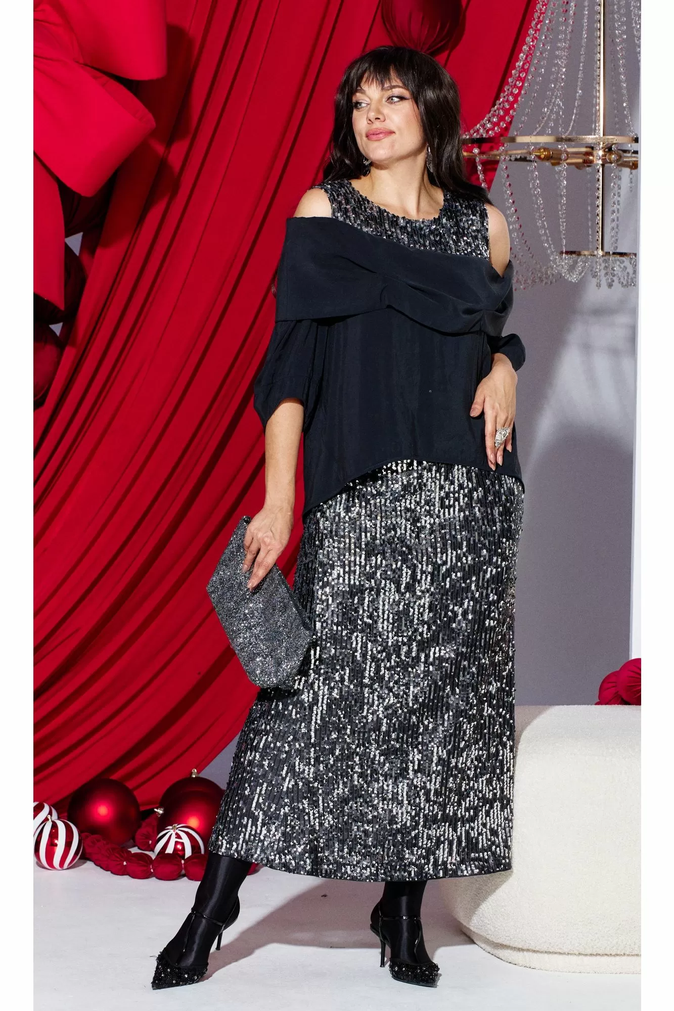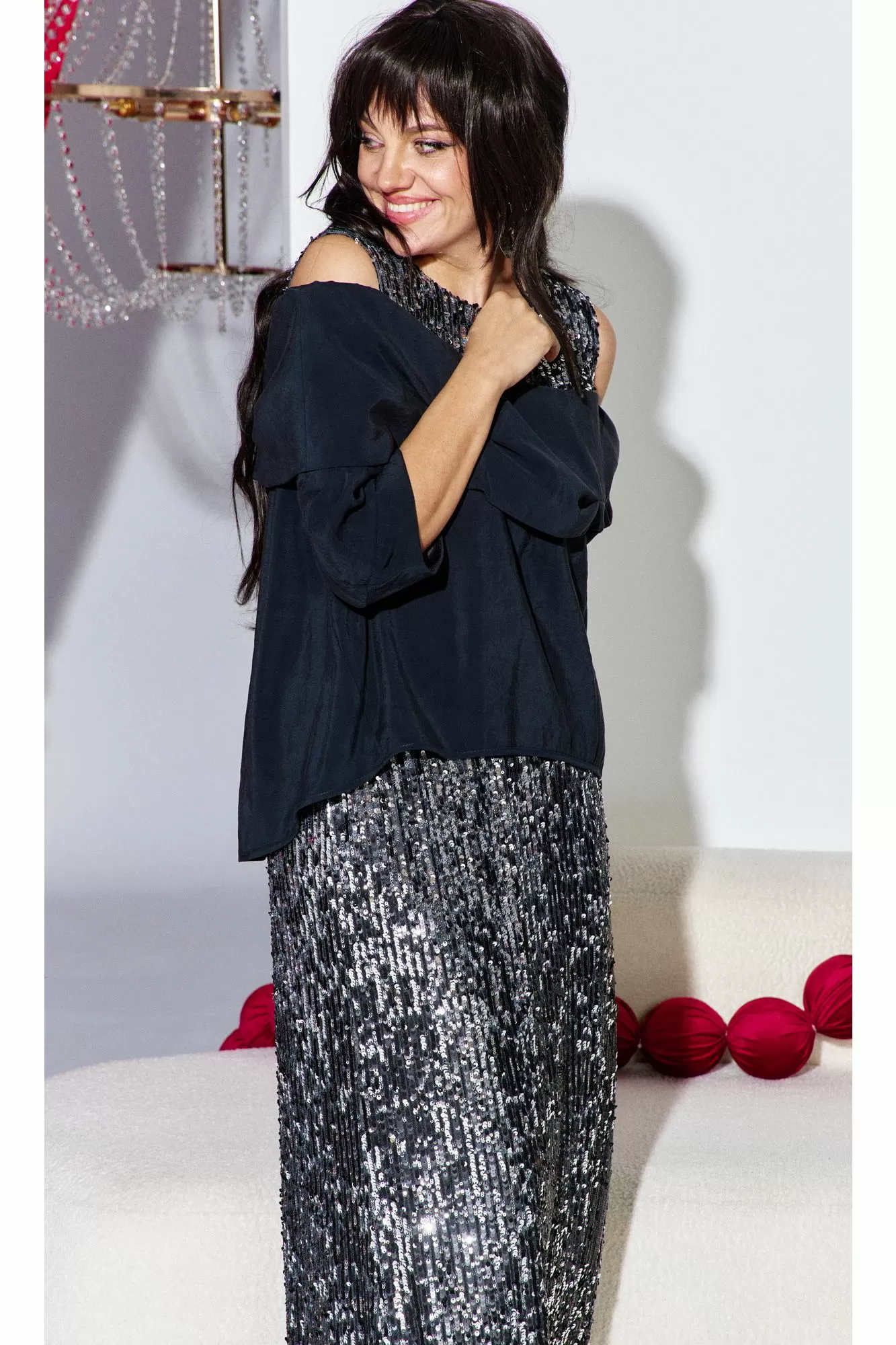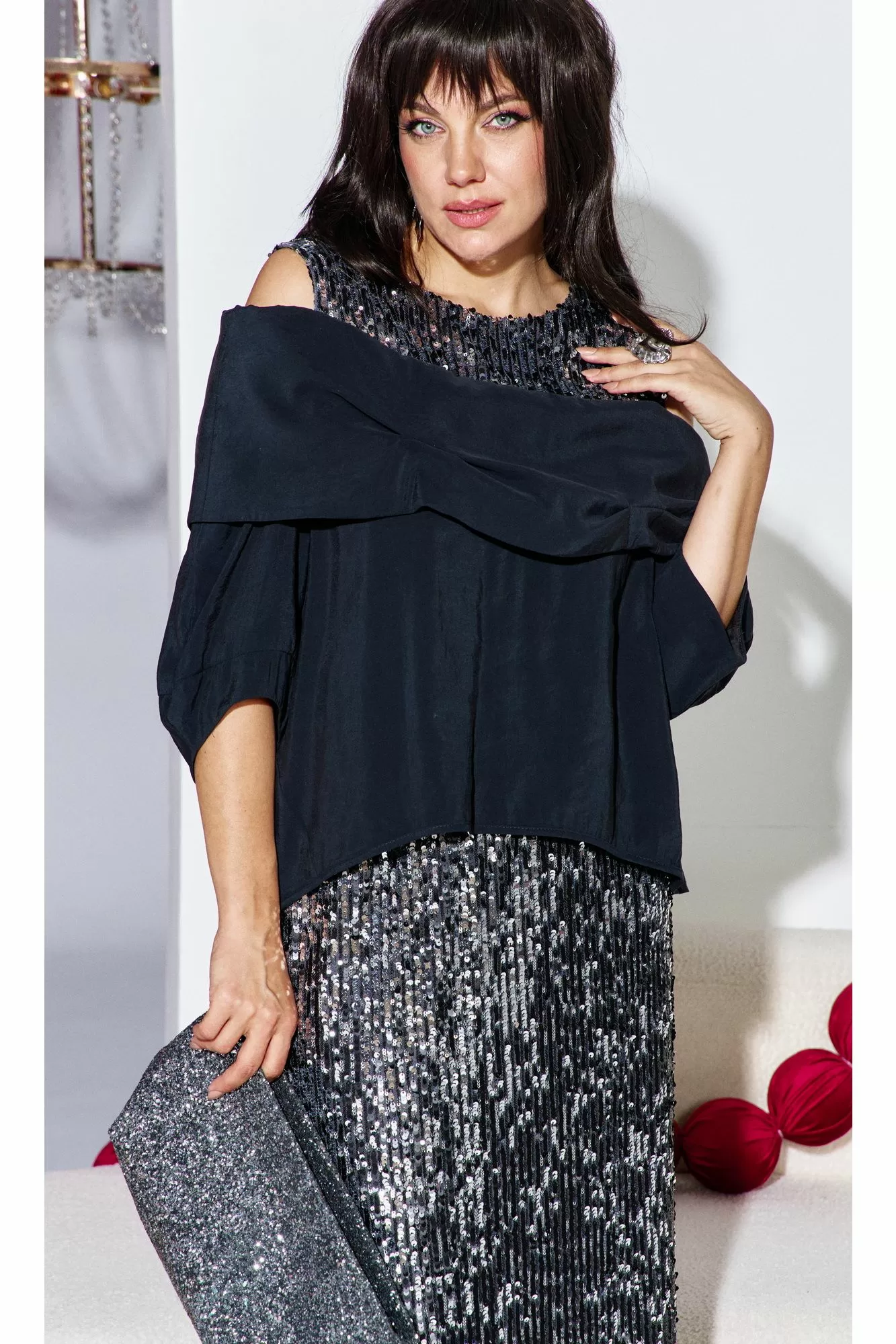 Этот юбочный комплект — для женщины, которая не боится владеть вниманием. Если Вы ищете идеальное сочетание стиля и комфорта, вот идеальный выбор. Комплект женский, состоящий из блузона и юбки. Блузон ( состав: 85% модал, 15% полиэстер ) — это настоящая скульптурная форма. Он начинается с откровенной игры линий: мягко ниспадая с плеч, он обнажает изящные ключицы и линию декольте. Блузон свободной формы с ассиметричным вырезом декольте, отложным воротником с декоративными защипами. По переду и спинке блузона отрезная кокетка из отделочной ткани — пайетки. Низ в платье ассиметричный, боковой шов в блузоне переходит на перёд. Рукав втачной, фигурной формы с декоративным подрезом, длиной ¾. Юбка (состав: 100% полиэстер, подкладка 100% полиэстер) длины « миди», прямого силуэта немного расширяется к низу. Пояс в юбке цельнокроеный с эластичной тесьмой-резинкой. Длина миди придаёт образу неустаревающую классику и грацию. Плотное полотно, сплошь усыпанное мелкими пайетками графитового и серебристого оттенков, не просто отражает свет, а мягко излучает собственное, приглушённое свечение. Юбка на подкладке. Длина блузы по спинке 71 см (р 48-52), 73 см (р 54-58). Длина рукава левого/правого 27/39 см. Длина юбки 96 см.